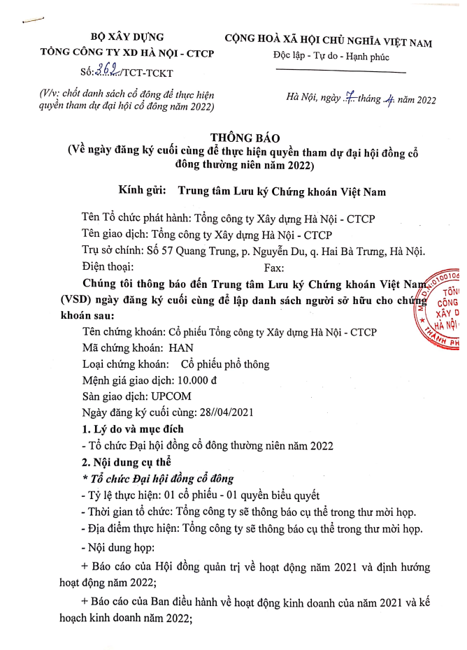 Thông báo chốt danh sách cổ đông để tổ chức Đại hội đồng cổ đông thường niên năm 2022 Để lại một bình luận / Tin cổ đông / Bởi Hancorp TCT xây dựng HN – CTCP Thông báo chốt danh sách cổ đông để tổ chức Đại hội đồng cổ đông thường niên năm 2022 Read More »