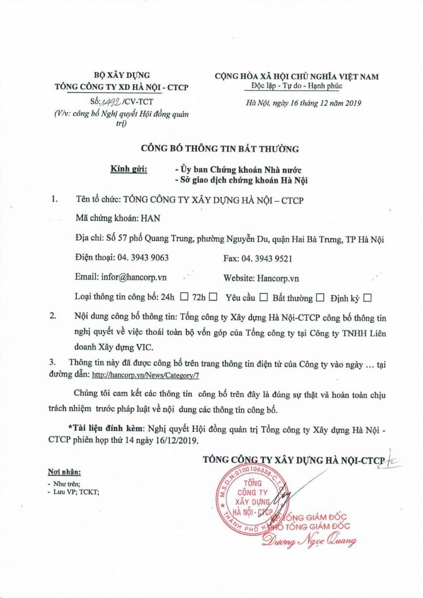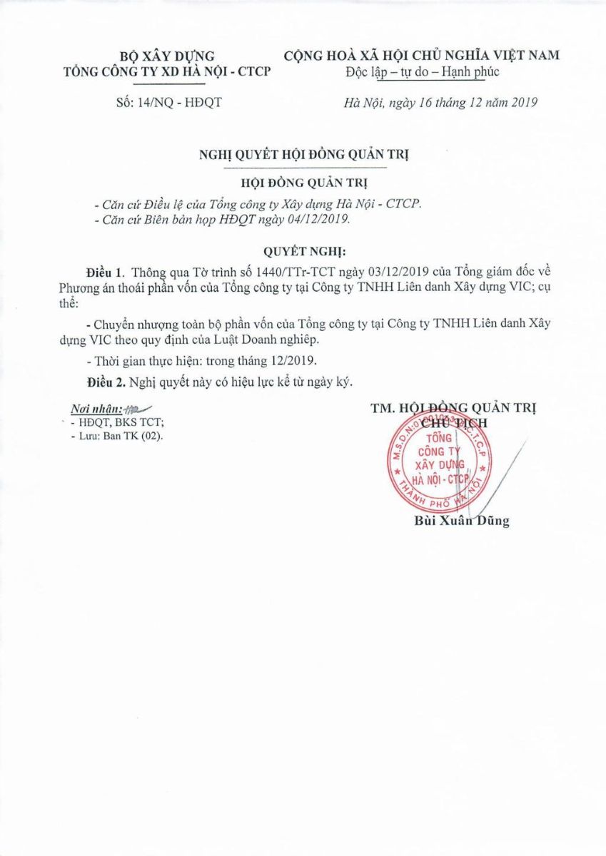 Hancorp công bố thông tin Nghị quyết về việc thoái toàn bộ vốn góp của Tổng công ty tại Công ty TNHH Liên doanh XD VIC