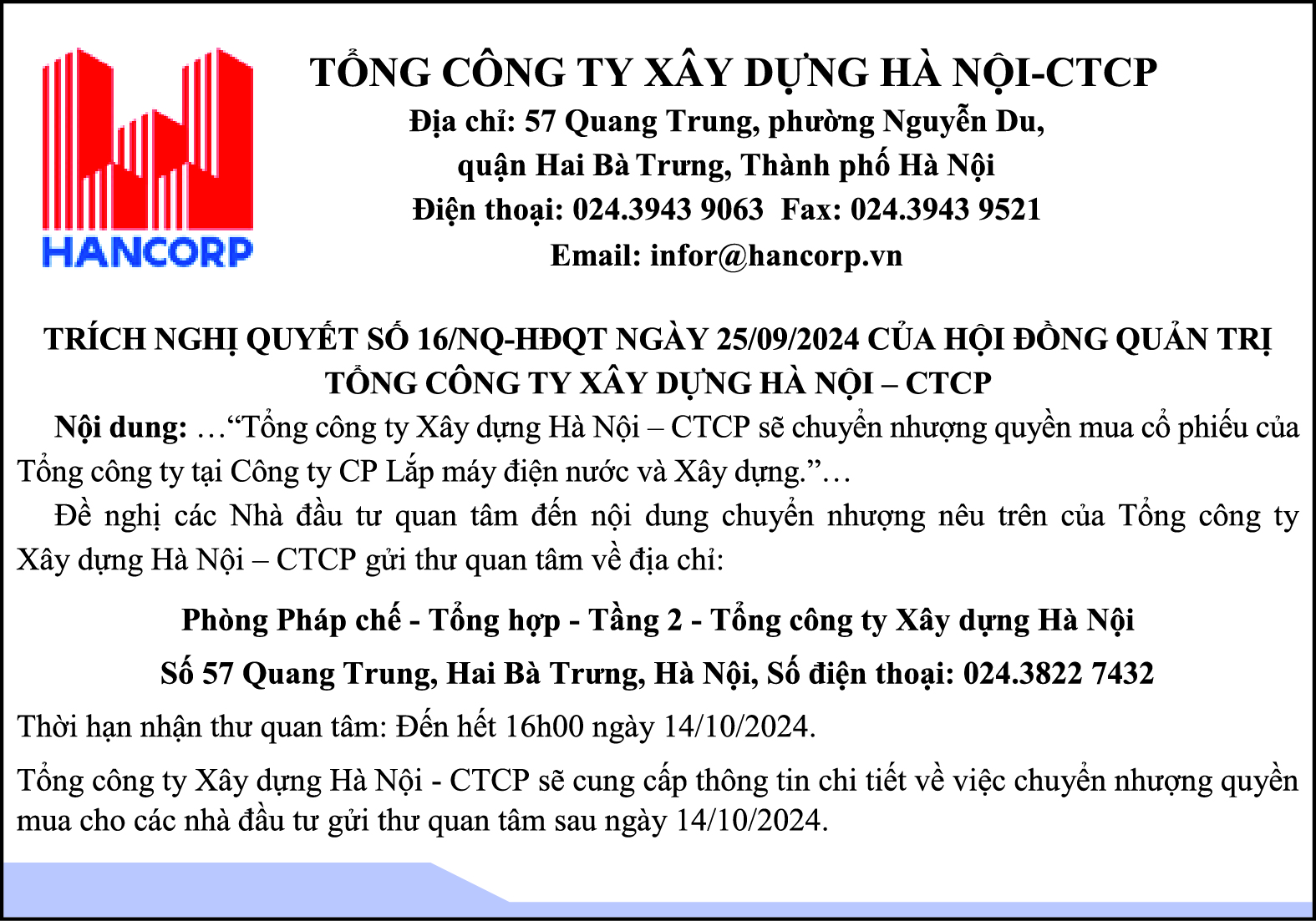 Thông báo chuyển nhượng quyền mua cổ phiếu của Hancorp tại Công ty cổ phần Lắp máy điện nước và xây dựng