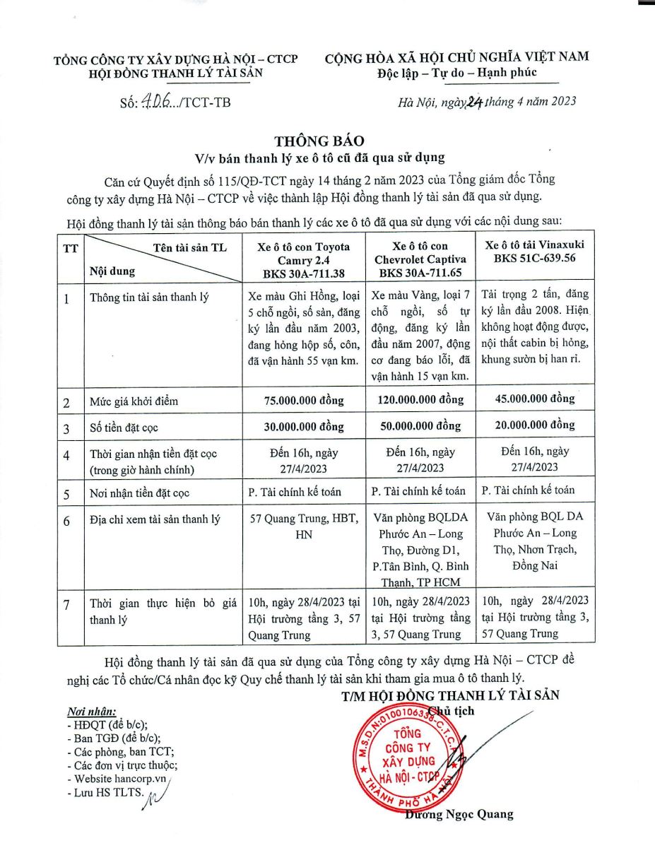 Thông báo thanh lý ô tô đã qua sử dụng