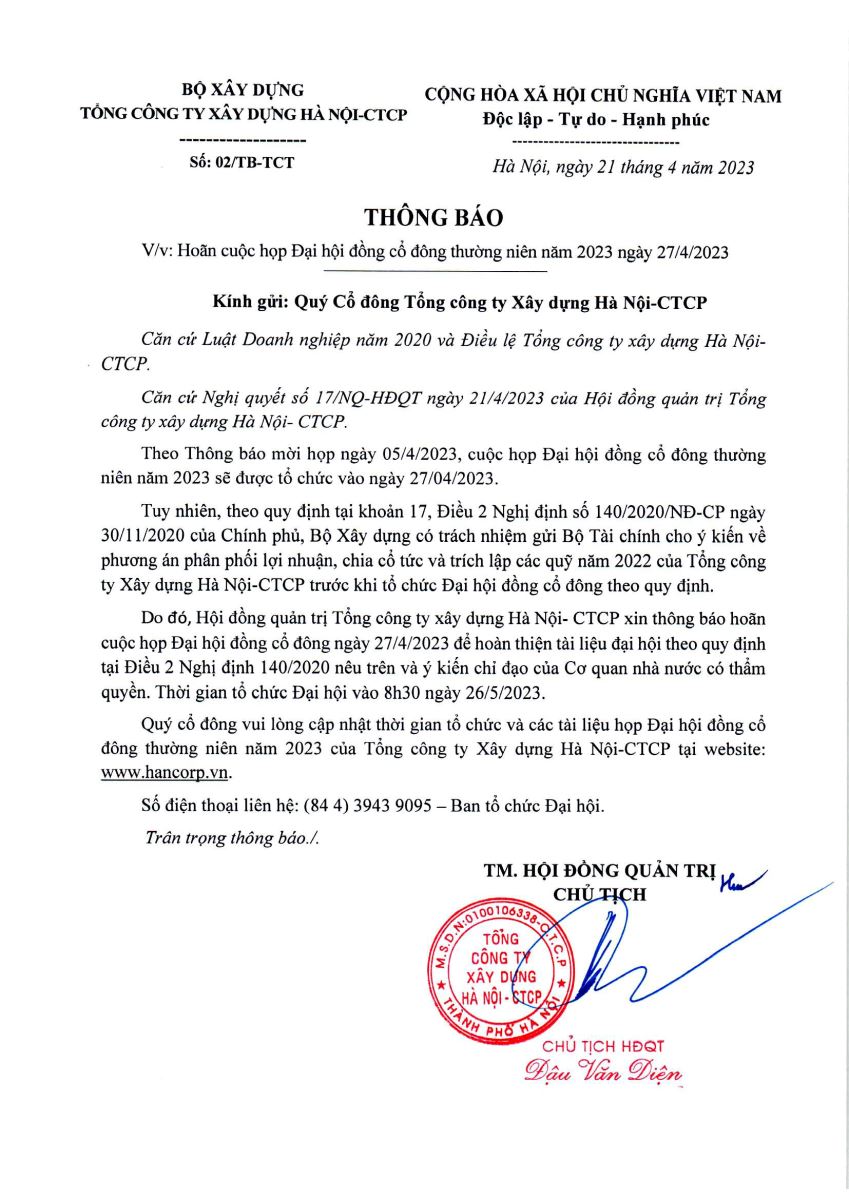 Thông báo thay đổi thời gian họp Đại hội đồng cổ đông thường niên năm 2023 của Tổng công ty XD Hà Nội – CTCP đến ngày 26/5/2023