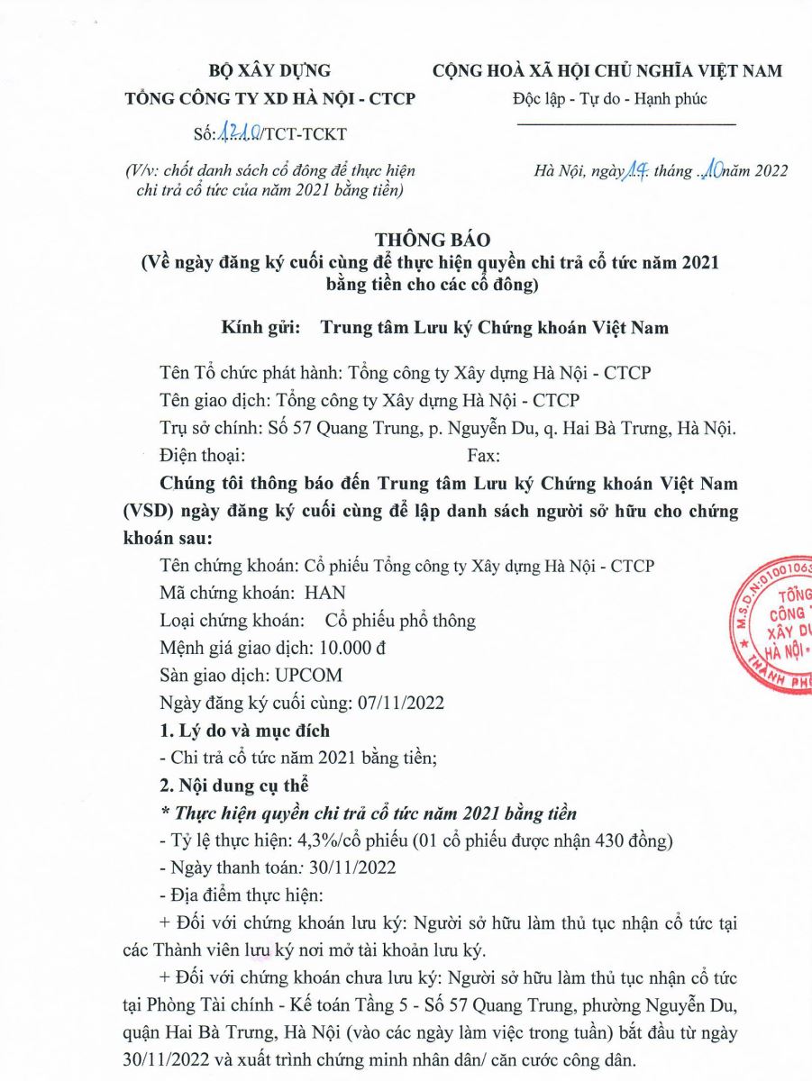 Thông báo về ngày đăng ký cuối cùng để thực hiện quyền chi trả cổ tức năm 2021 bằng tiền mặt cho các cổ đông.