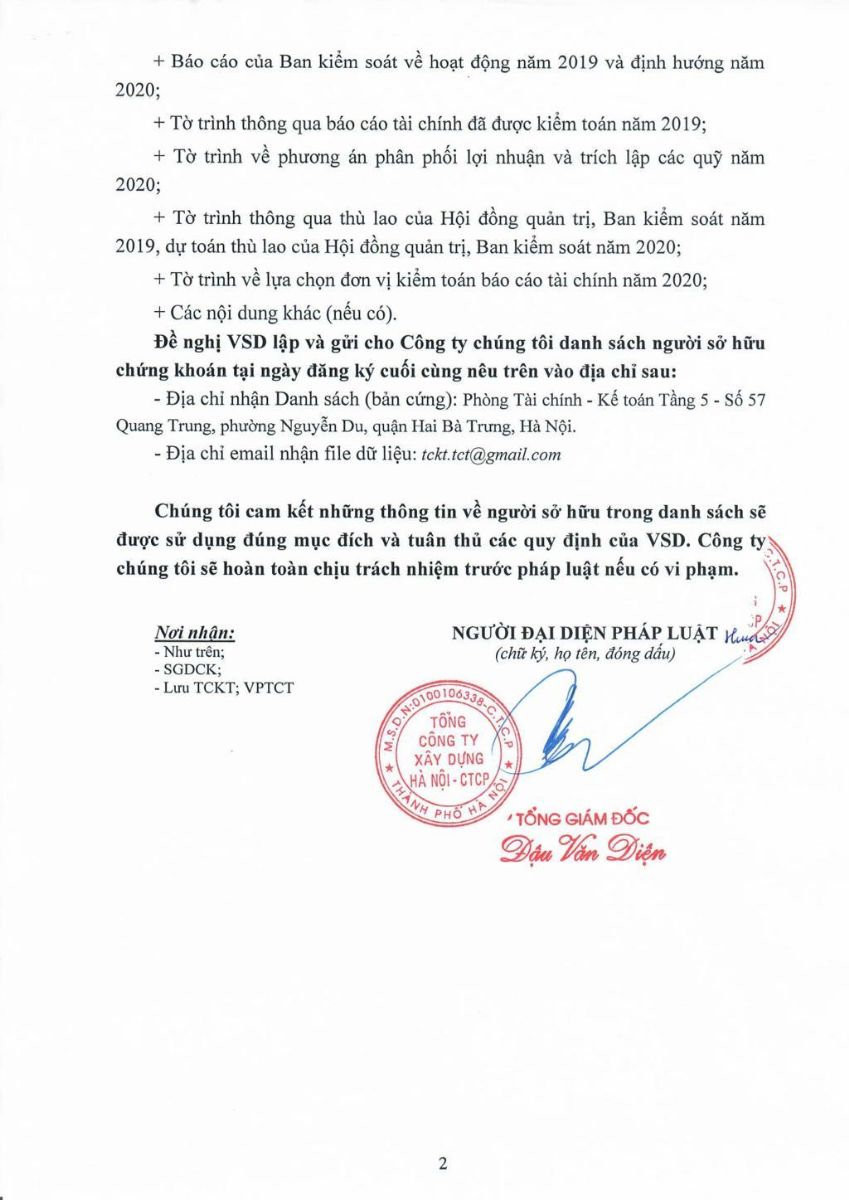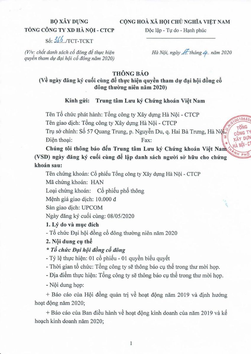Thông báo về ngày đăng ký cuối cùng để thực hiện quyền tham dự Đại hội đồng cổ đông thường niên năm 2020
