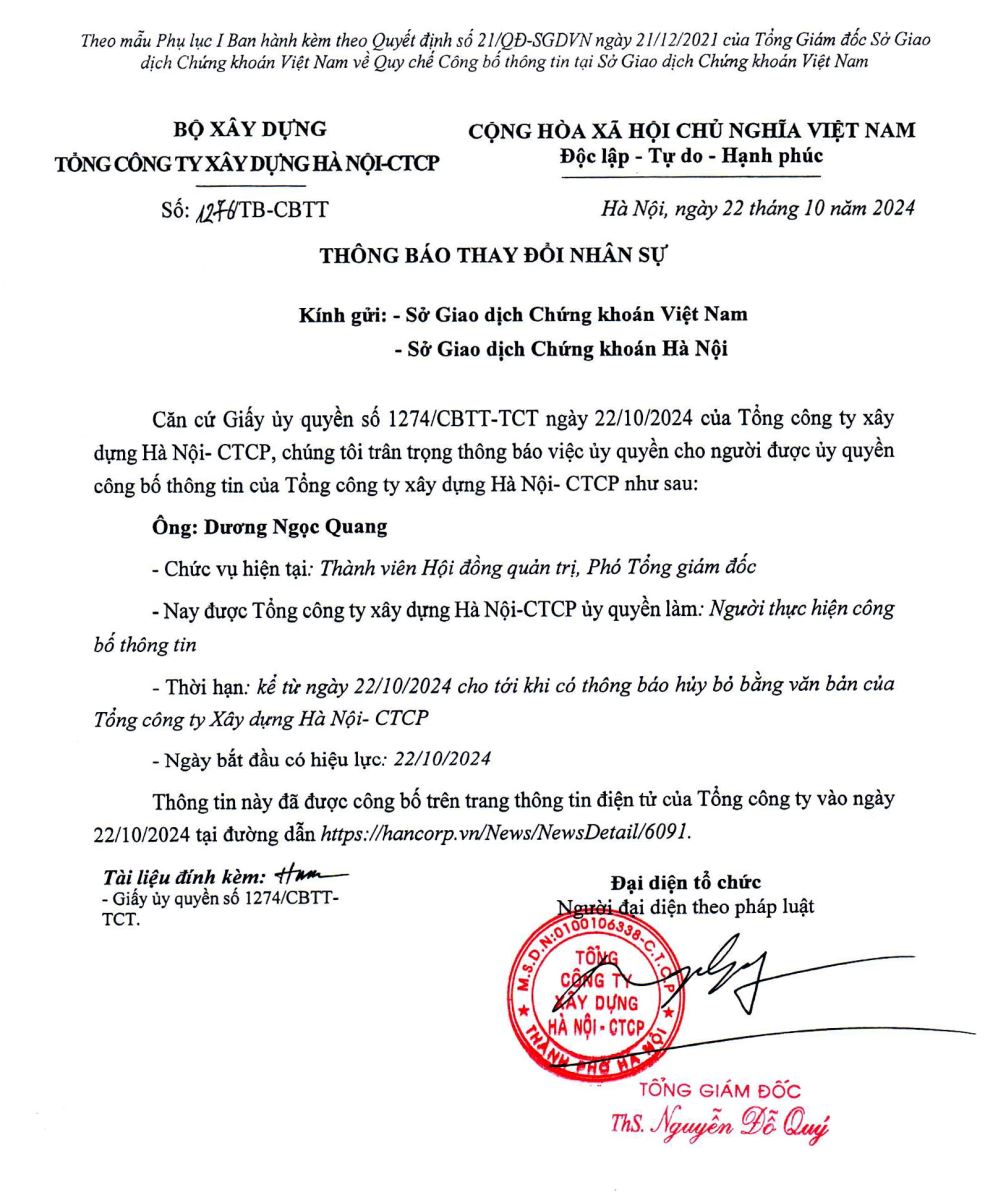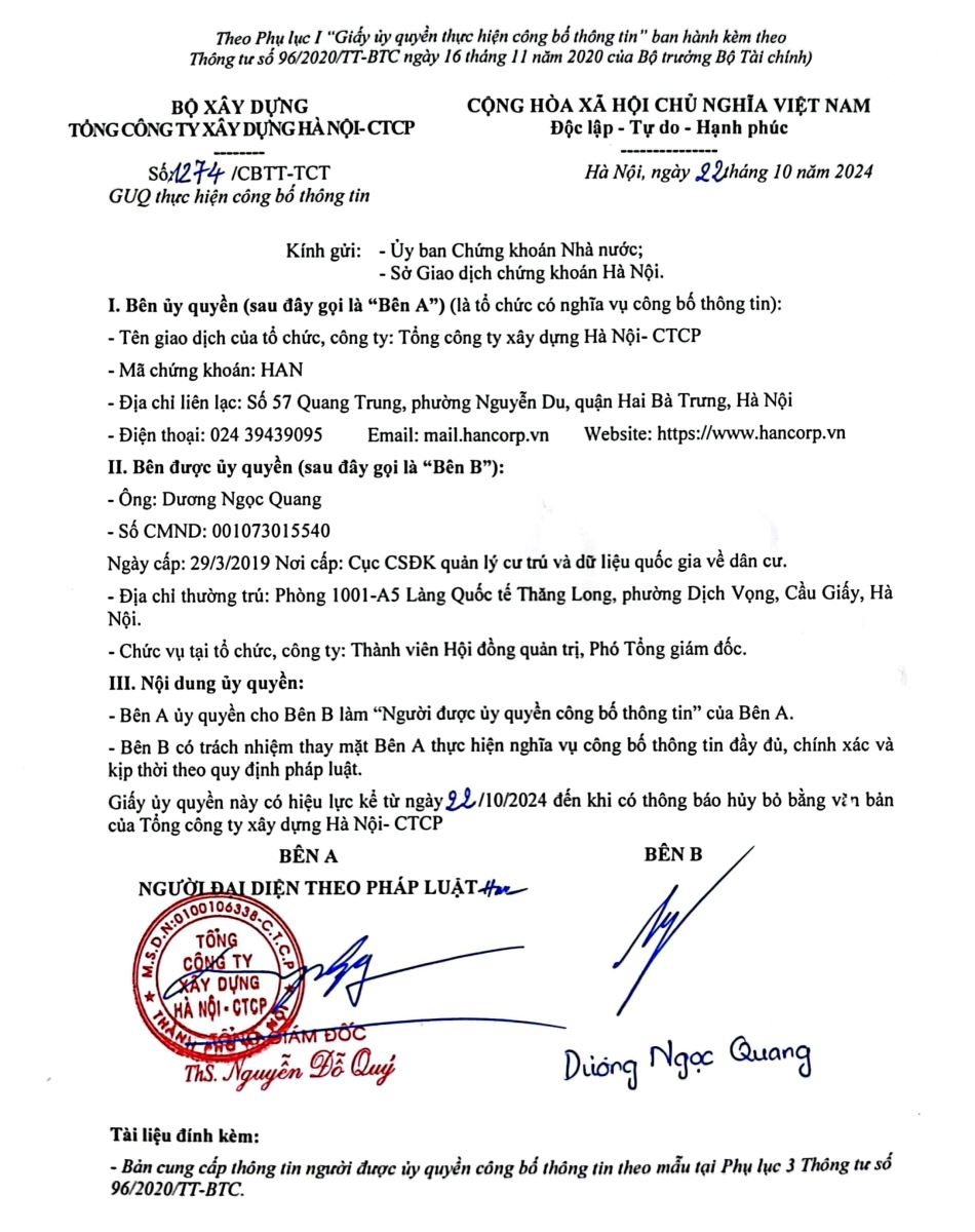 Thông báo về việc ủy quyền cho Ông Dương Ngọc Quang – Thành viên HĐQT, Phó TGĐ công bố thông tin của HANCORP