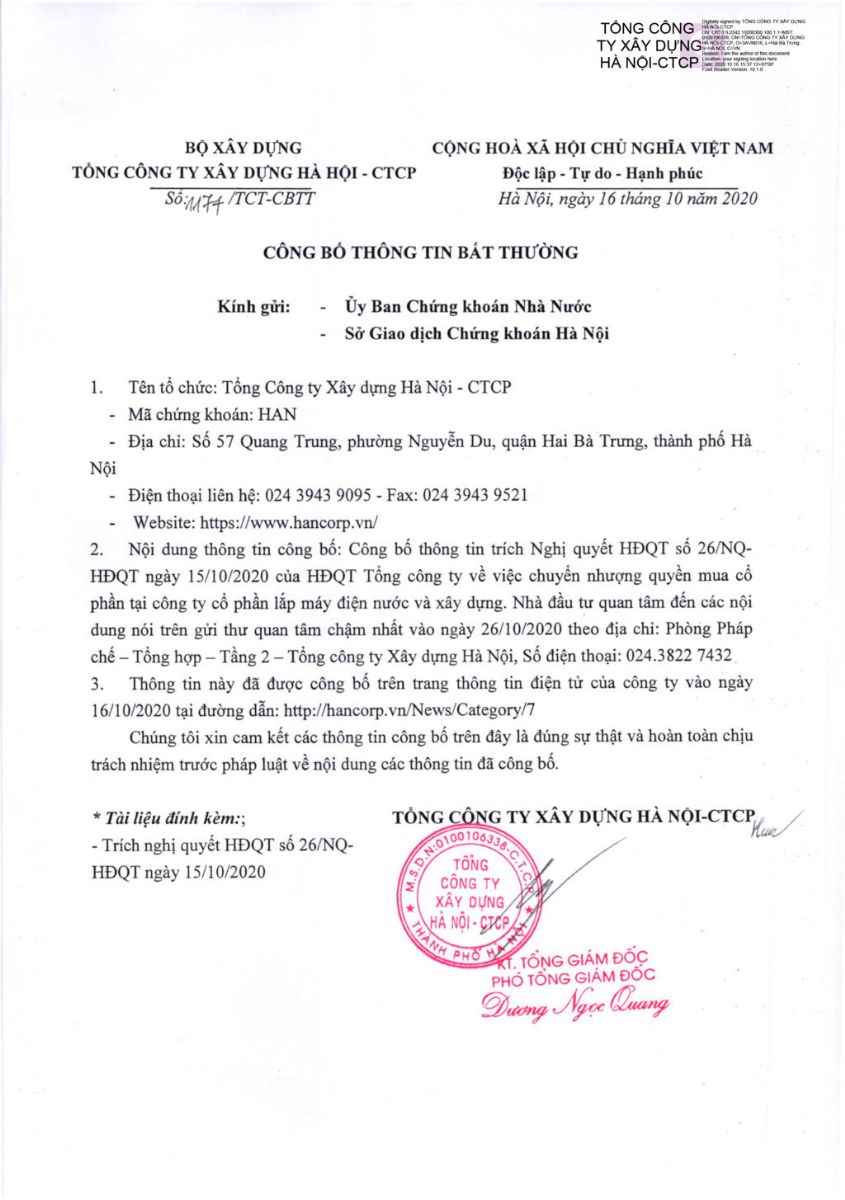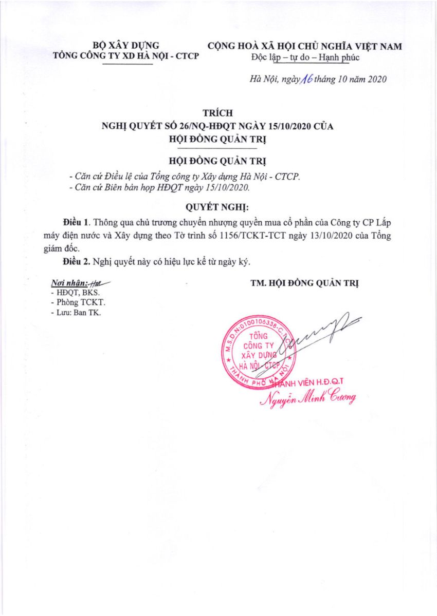 Trích nghị quyết số 26/NQ-HĐQT của HĐQT: …”Chuyển nhượng quyền mua CP của Hancorp tại CT CP Lắp máy điện nước và XD”…